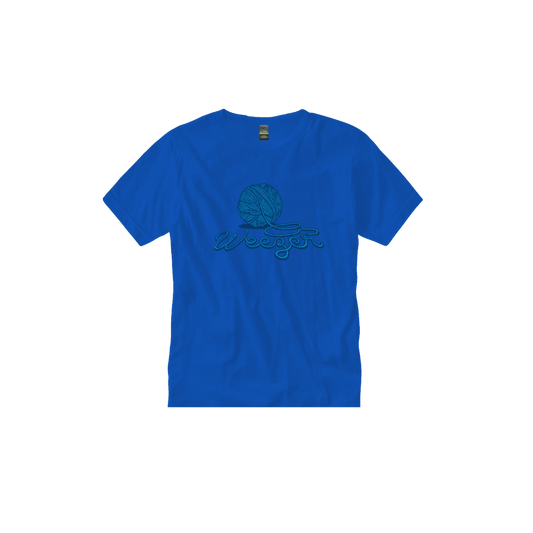 • Cream-colored t-shirt featuring a Weezer album cover image of a lush green forest scene.