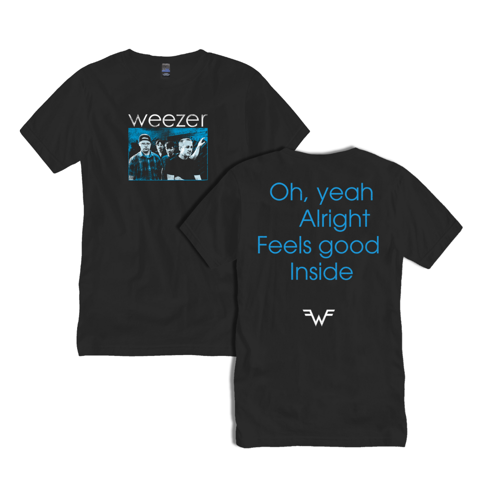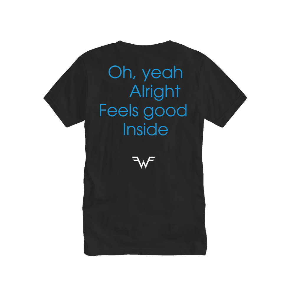 100% USA cotton unisex black t-shirt with a light weight, slim fit. Weezer band photo on front and lyrics from "Say It Ain't So" on back.